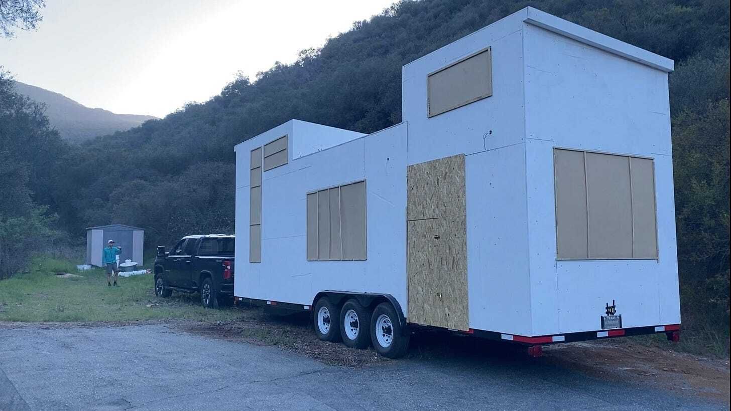 HERE’s THE SHELL (pre-windows and siding) we purchased from Tiny Topanga. They did a kick-ass job on this build. Solid trailer, steel structure. It’s well made. It’s going to be GORGEOUS once we get those big windows in everywhere and the reclaimed redwood siding on. PATIENCE is the name of game here, while we seek financial abundance to finish this project. As they say in the startup world, the project will get finished, capital will just help expedite things. This home is our first asset in the business. It will eventually be used as a vacation rental space to community members when we upsize some day.